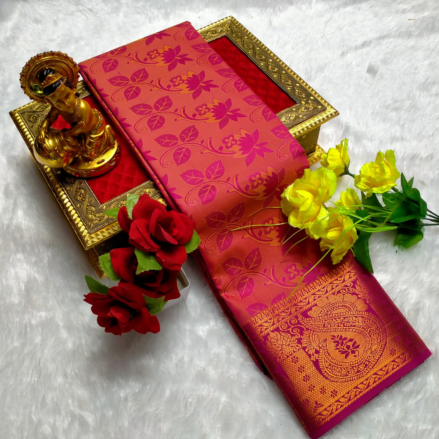 The saree features a delightful coral pink base, a cheerful and flattering colour that brightens any occasion. The body is intricately adorned with a charming all-over self-woven pattern of floral vines and delicate leaves in a contrasting darker pink or fuchsia shade. This exquisite weave adds a luxurious texture and depth to the fabric.
